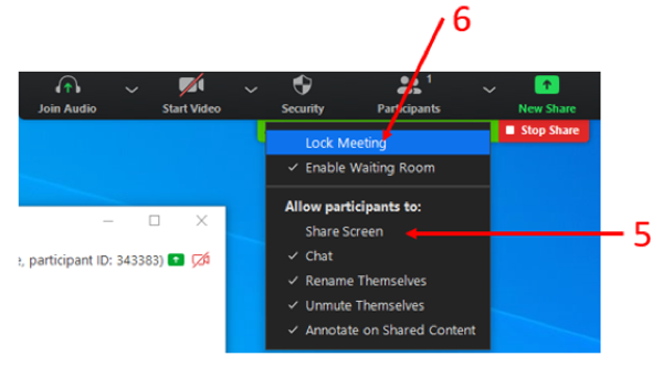Númer 6 Læsa fundinum, þannig að eftir að fundur hefst þá getur enginn komist inn, ekki einu sinni með löglegum aðgangsheimildum. Hér skiptir máli hvort fundurinn sé fyrir lokaðan hóp eða opinn öllum.